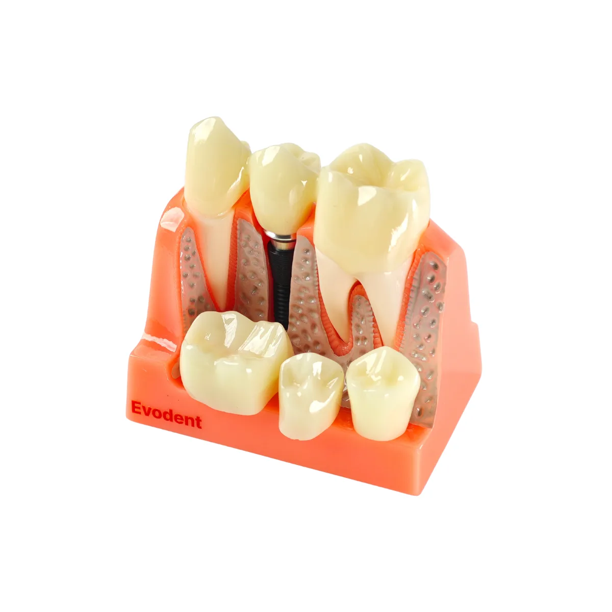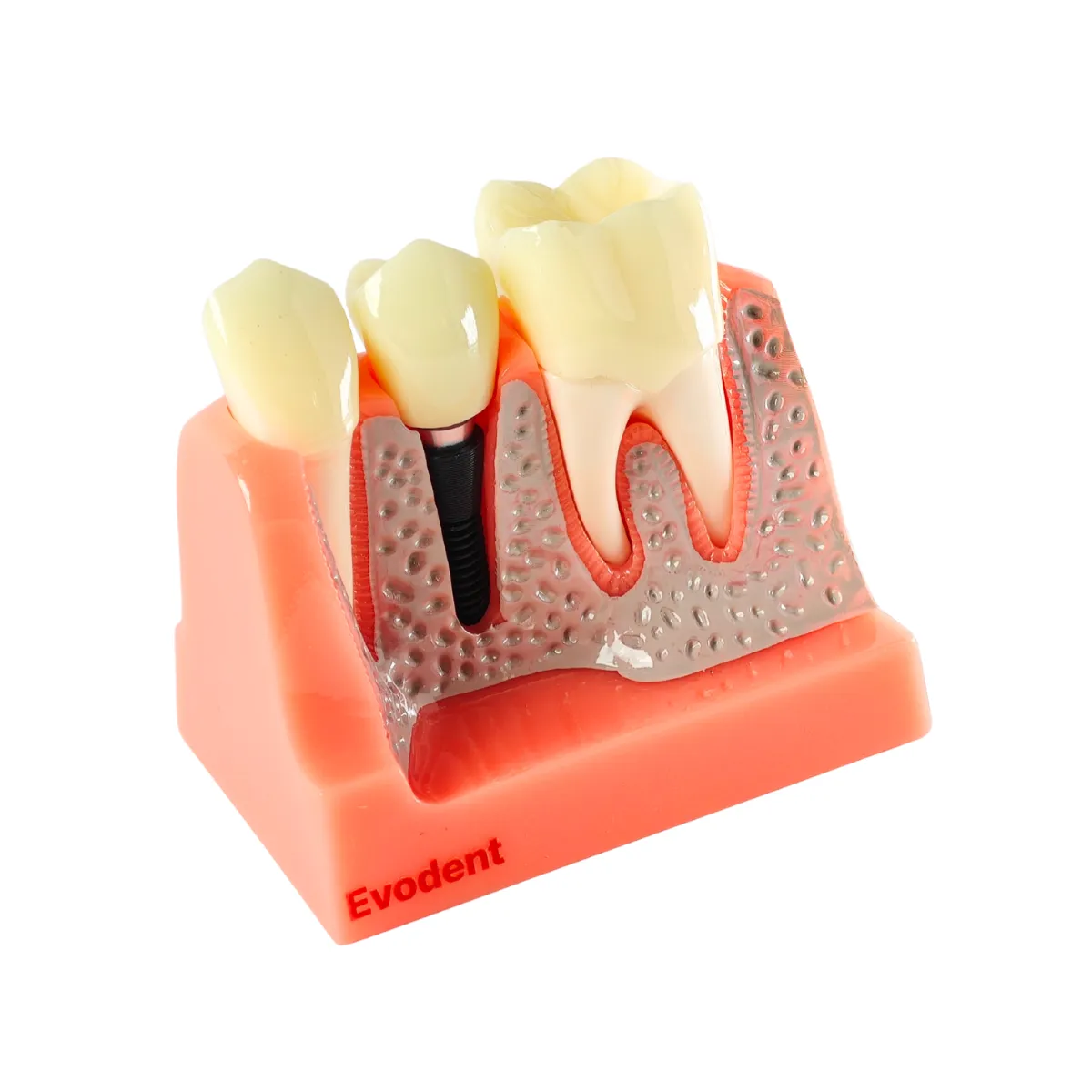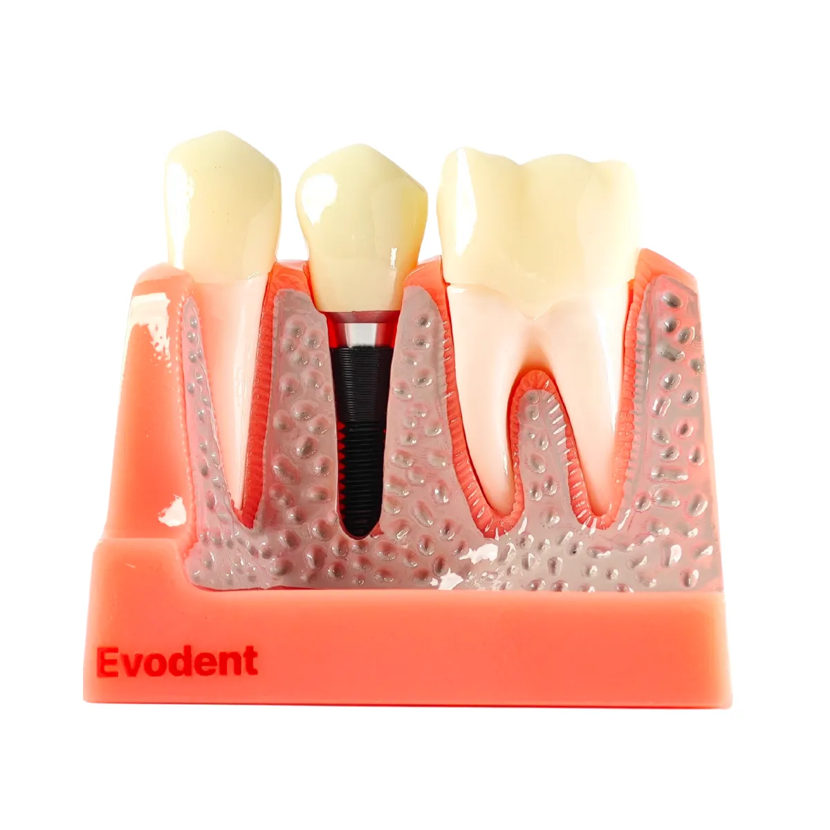 The Evodent Dental Implant Demonstration Model is designed to visually explain the relationship between the implant fixture, crown, gingiva and surrounding bone all in one compact block, instead of abstract explanations or diagrams, this model lets patients and students see what words often fail to explain.